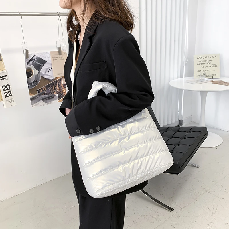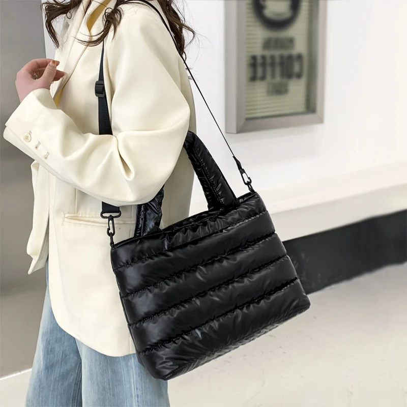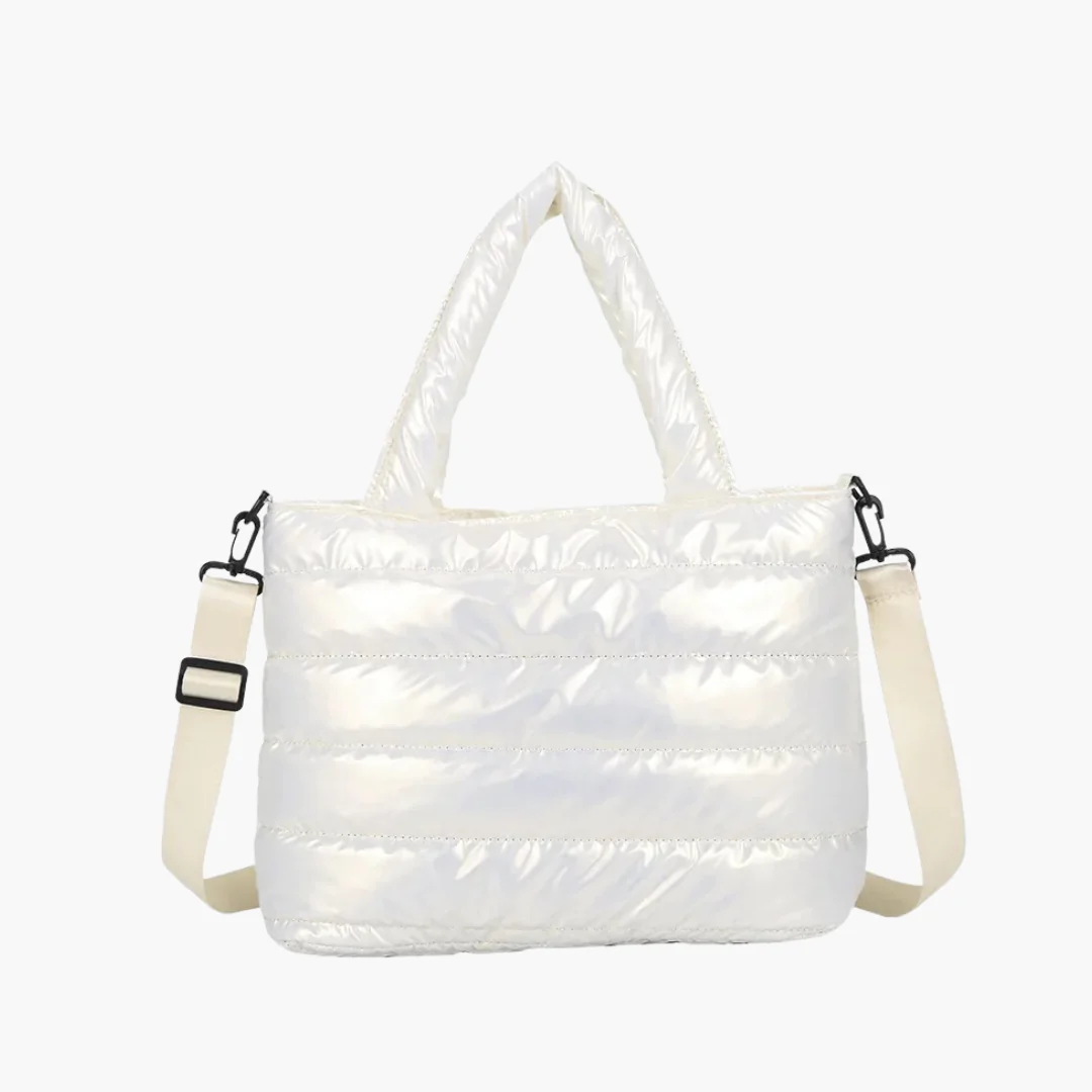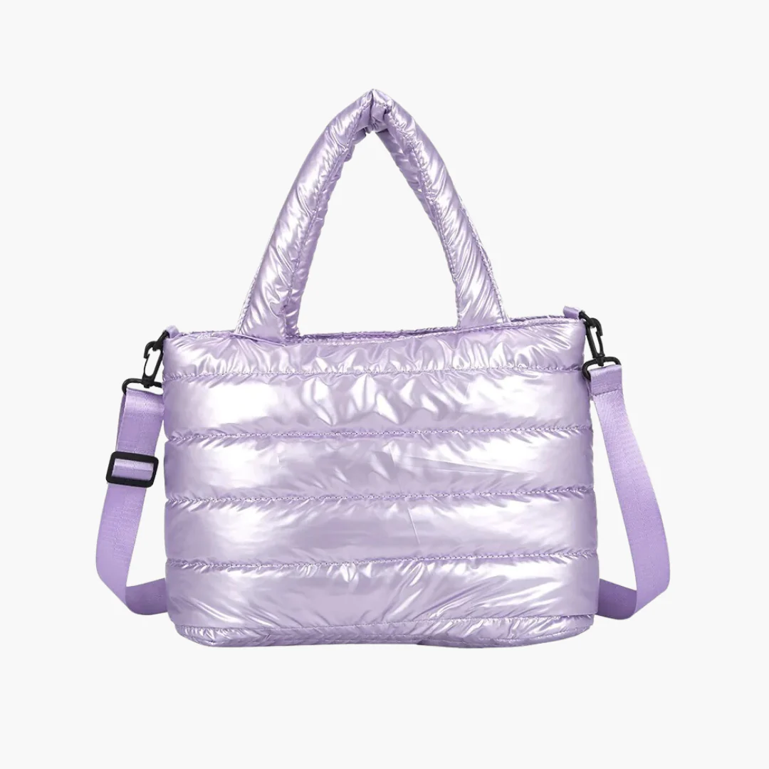 Crafted from cotton and shiny nylon, the Satin Puffer Bag is a unique tote bag that is perfect for your daily commute or running errands. A zipper opens up to a spacious interior that will easily fit all your daily essentials. Comes with an extra shoulder strap for maximum versatility. Available in multiple beautiful colors that match any outfit, dress it up or down, the options are endless!